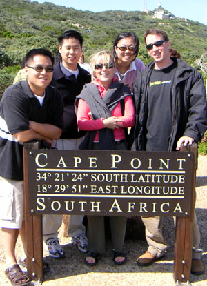 Sunday, a few of us headed down to Cape Point, which is the southernmost point of Africa. We climbed the point, and we ended up seeing a whole lot of different small animals, including a tortoise, a turtle, a few ostriches (yep – and we had just ate ostriches the night before), a small group of penguins, and a whole lotta baboons. Remind me to tell you the story of how scary those baboons can get… =) In the evening, Peter (my client) invited us to visit his church where he leads worship. It’s a Baptist church… but I realized that “Baptist” means something very different outside the U.S. than it does in the U.S. – it’s definitely significantly more charismatic than you would think.